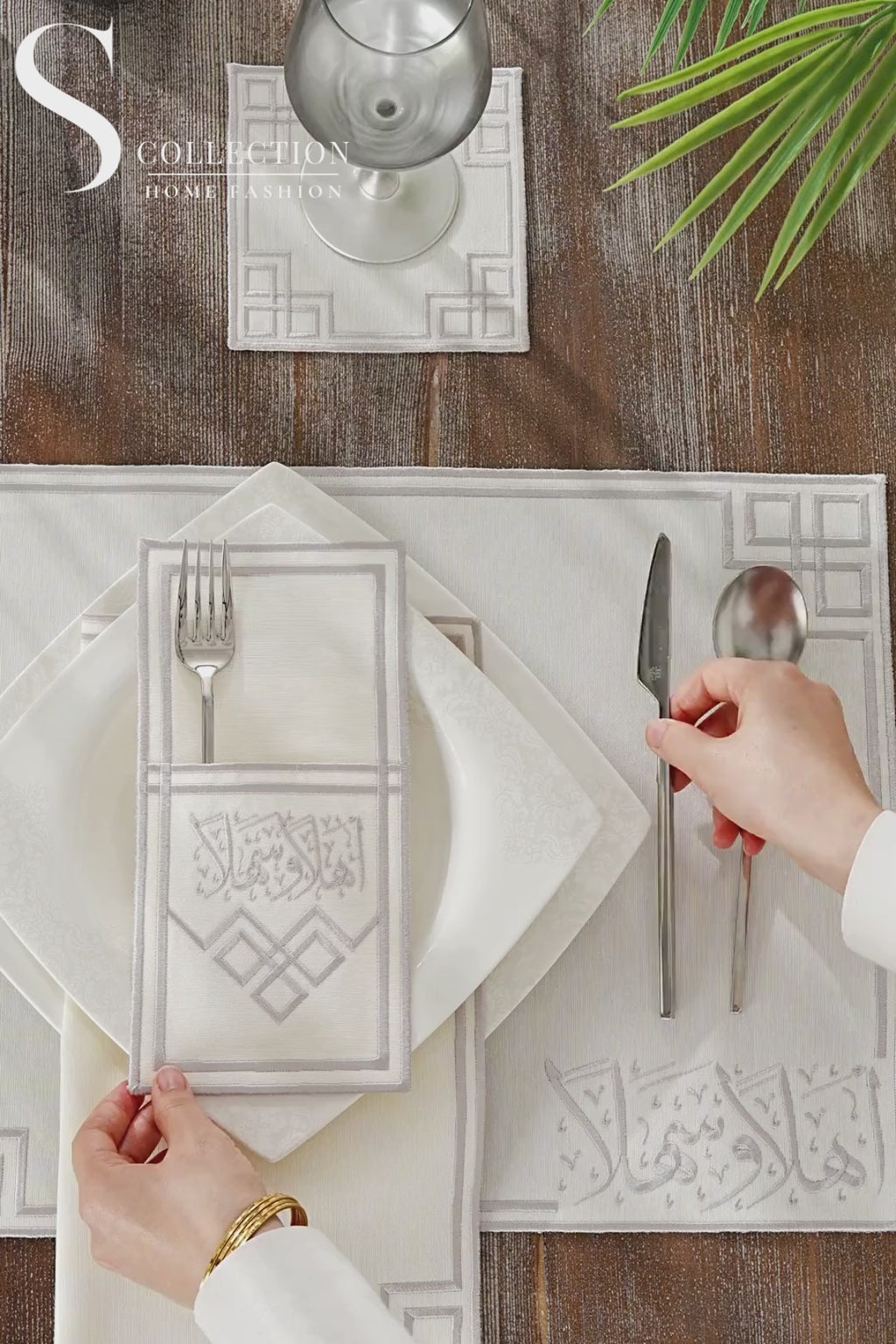 طقم مفارش سفرة - عبارة (اهلا وسهلا) - تطريز فضى - قماش مقاوم للماء - ٦ اشخاص - ٢٤ قطعة - طقم كامل