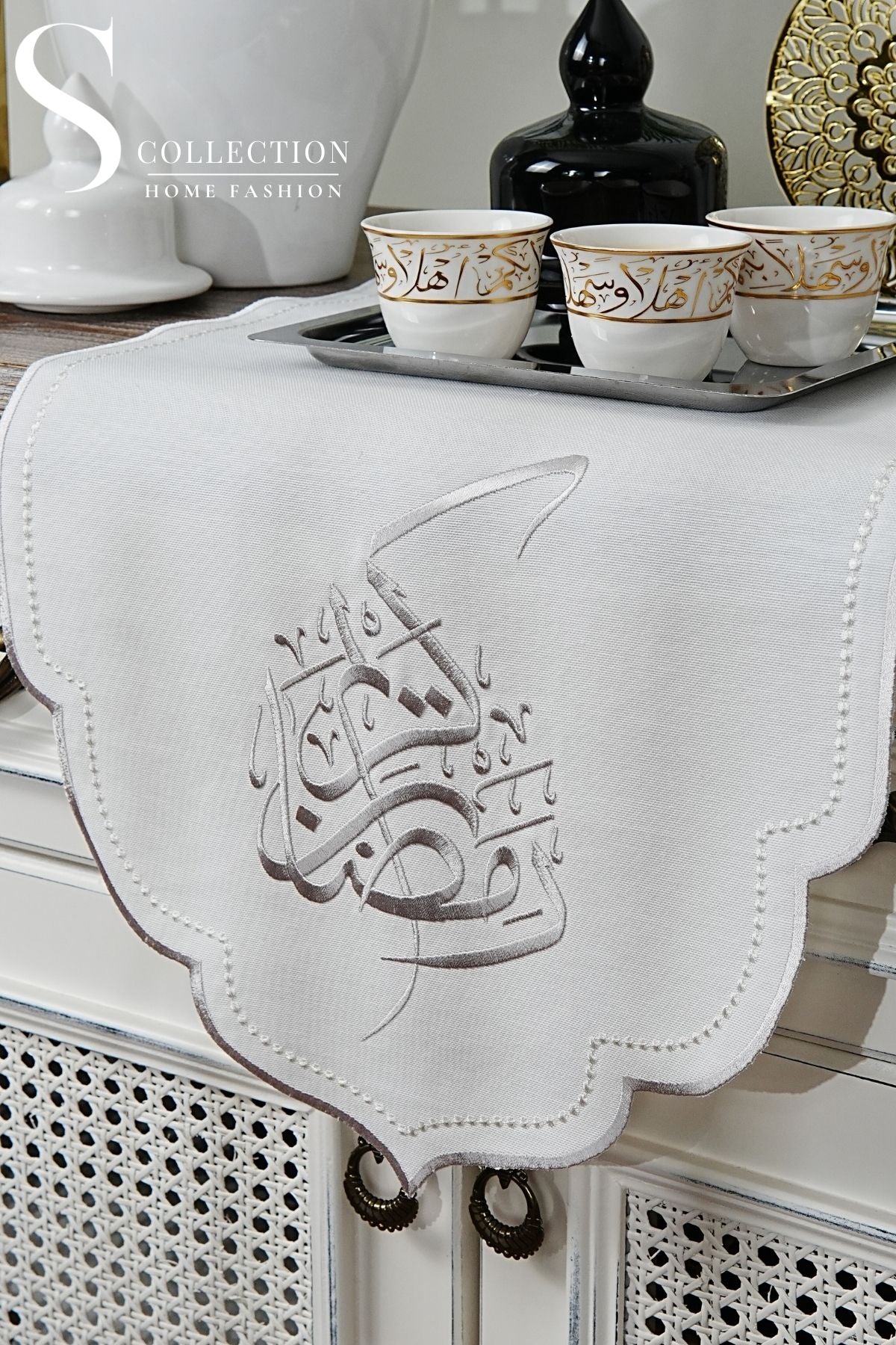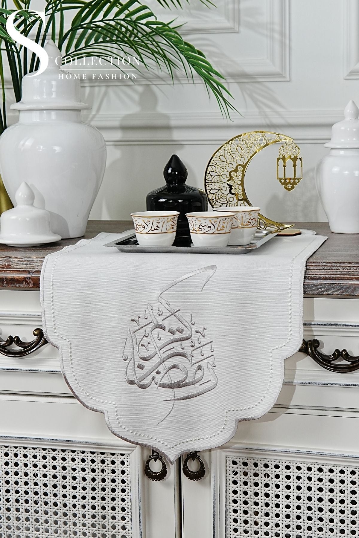 رانر طاولة مطرز - تصميم رمضان - قماش مقاوم للماء - تطريز فضى