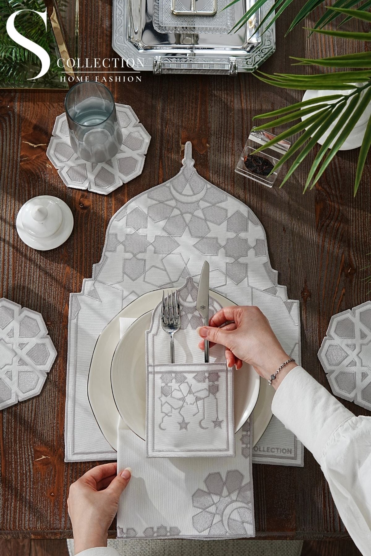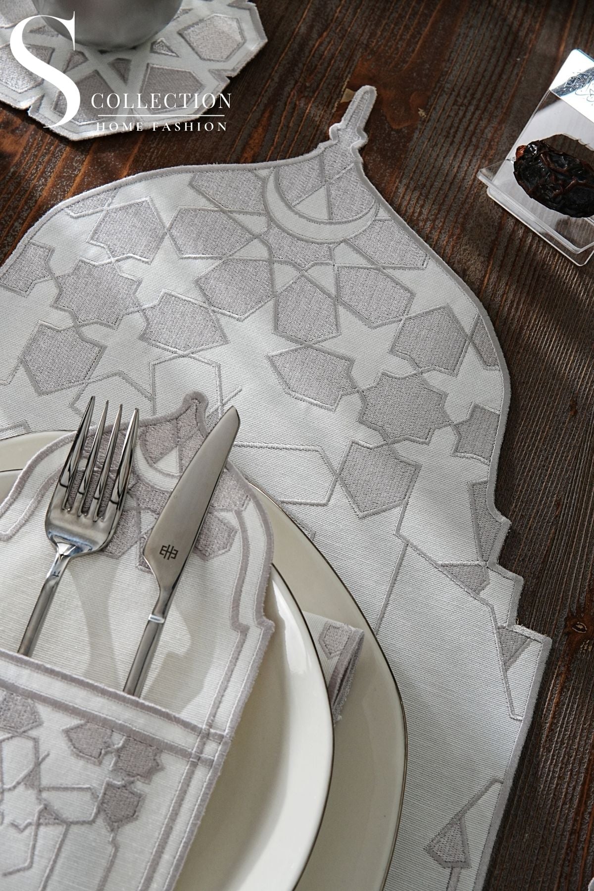 طقم مفارش سفرة - تصميم قبة رمضان - تطريز فضى - قماش مقاوم للماء - ٦ أشخاص - ٢٤ قطعة - طقم كامل