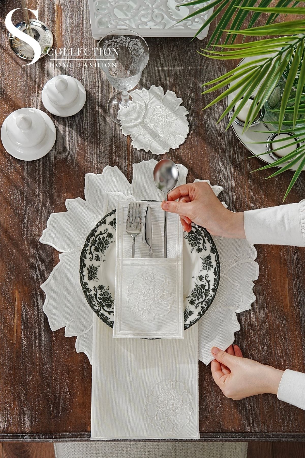 طقم مفارش سفرة - تصميم إلويس - تطريز اوف وايت - قماش مقاوم للماء - ٦ اشخاص - ٢٤ قطعة - طقم كامل