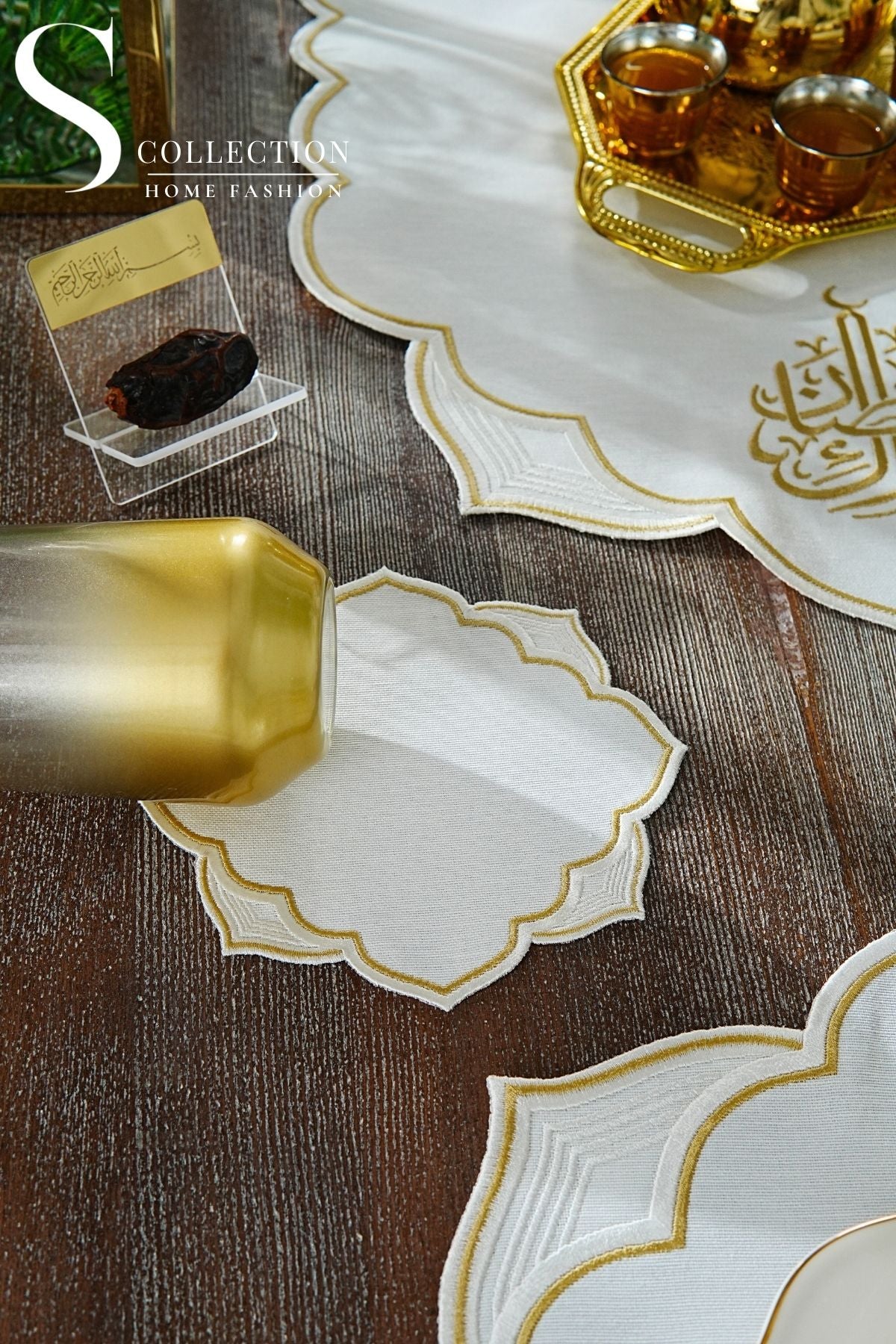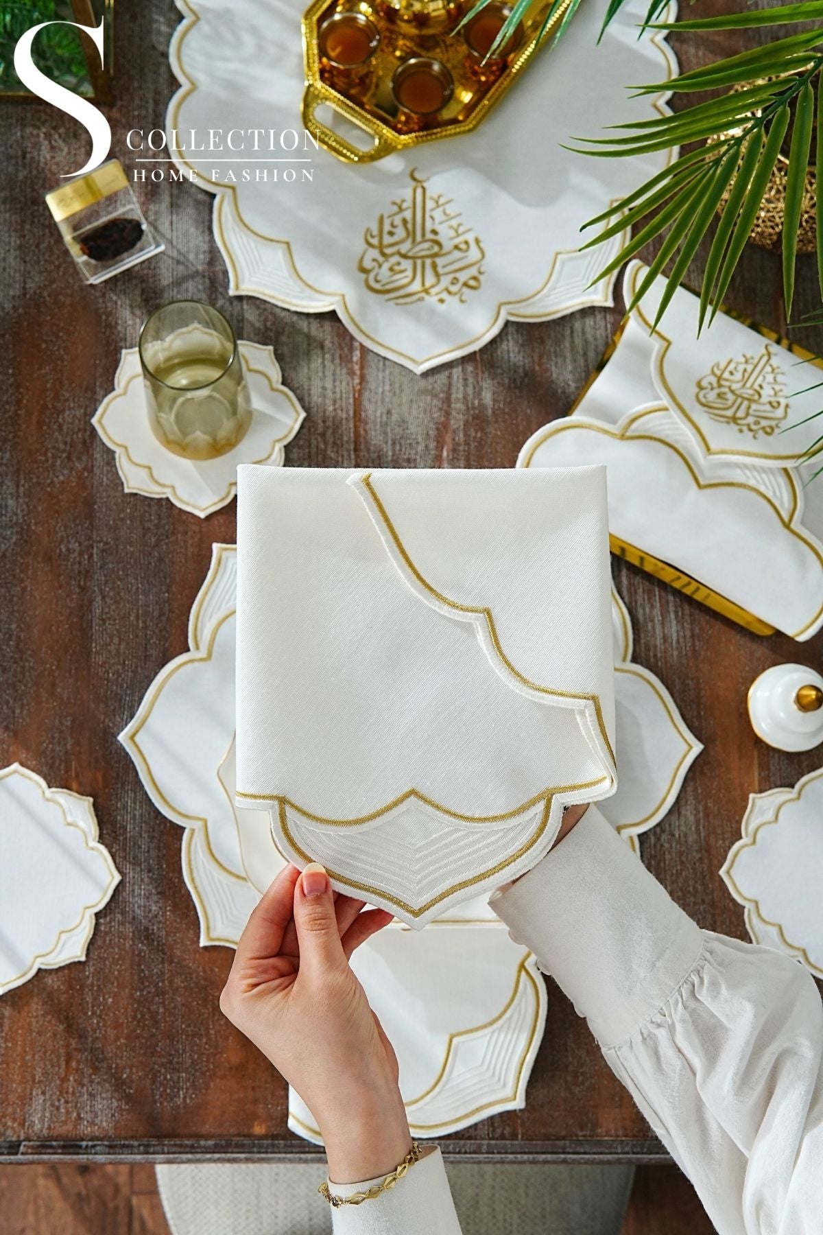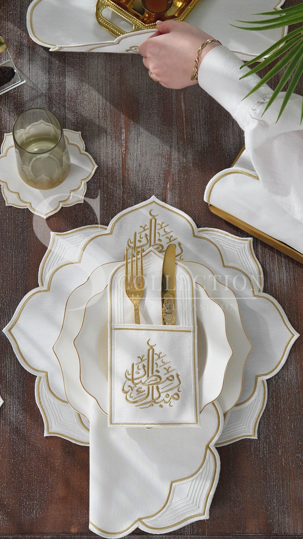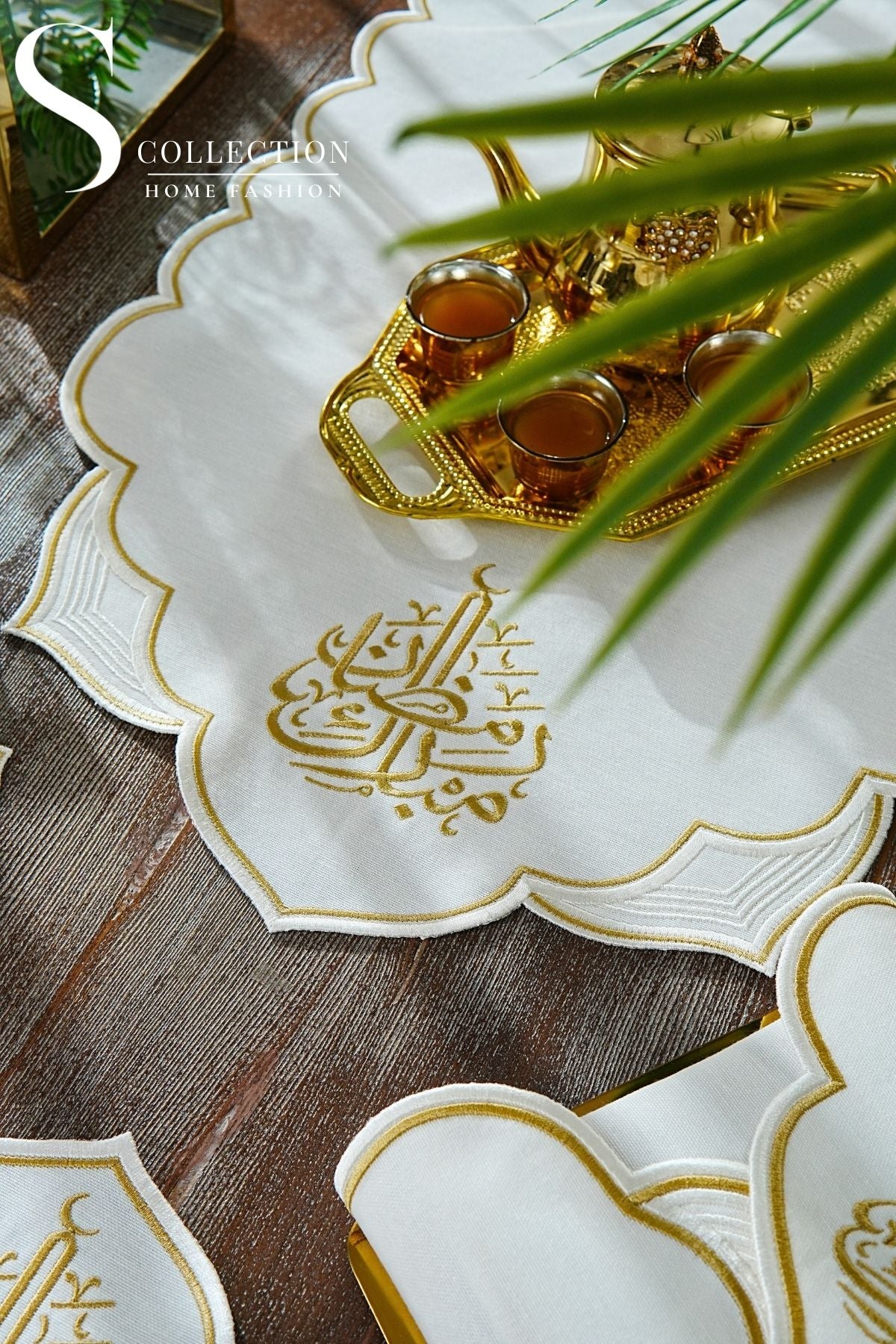 طقم مفارش سفرة كامل - تصميم نجمة رمضان - مع منديل سلة الخبز ورانر - تطريز ذهبى واوف وايت - ٦ أشخاص - ٢٦ قطعة