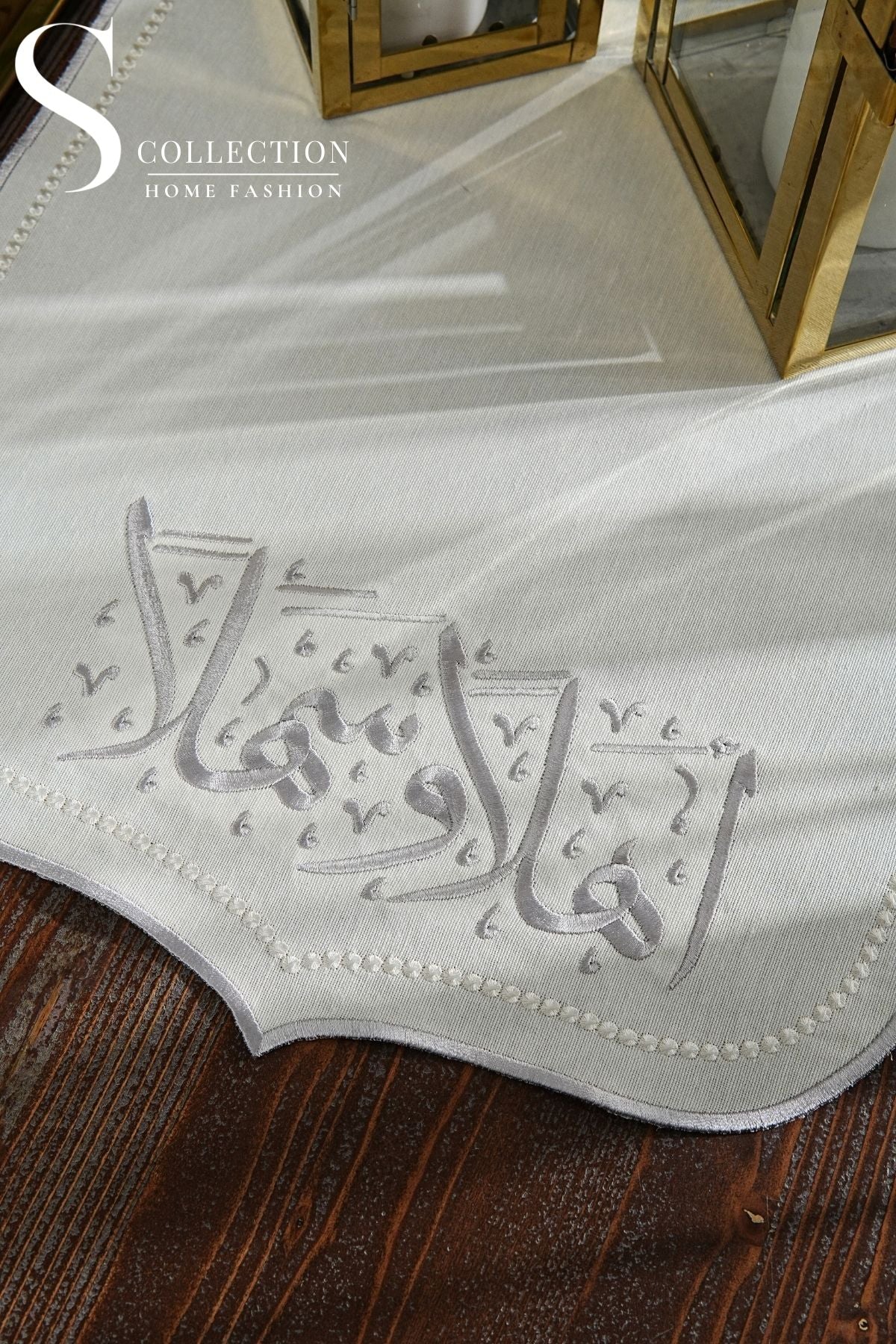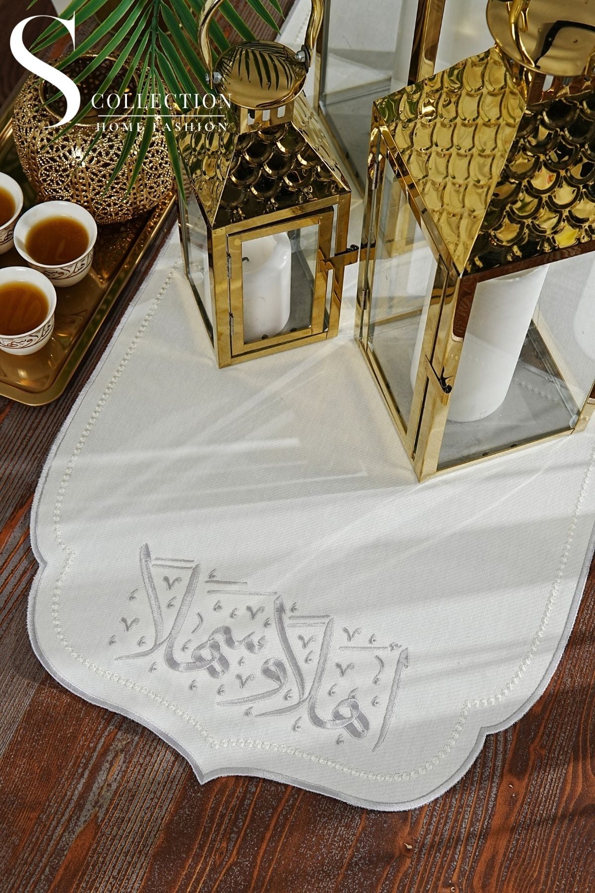 رانر طاولة مطرز - تصميم اليجانس (عبارة اهلا وسهلا) - تطريز فضى - قماش مقاوم للماء