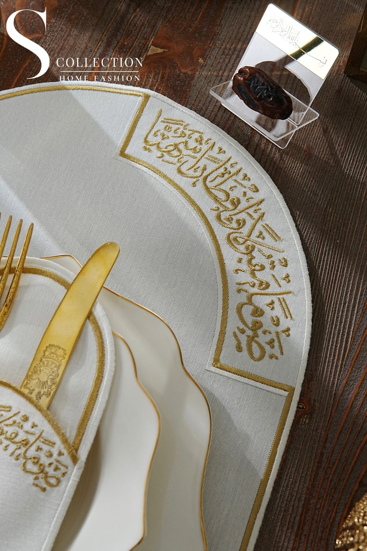 طقم مفارش أطباق مع جيوب ادوات مائدة - تصميم نور رمضان - تطريز ذهبى واوف وايت - قماش مقاوم للماء - ٦ اشخاص - ١٢ قطعة