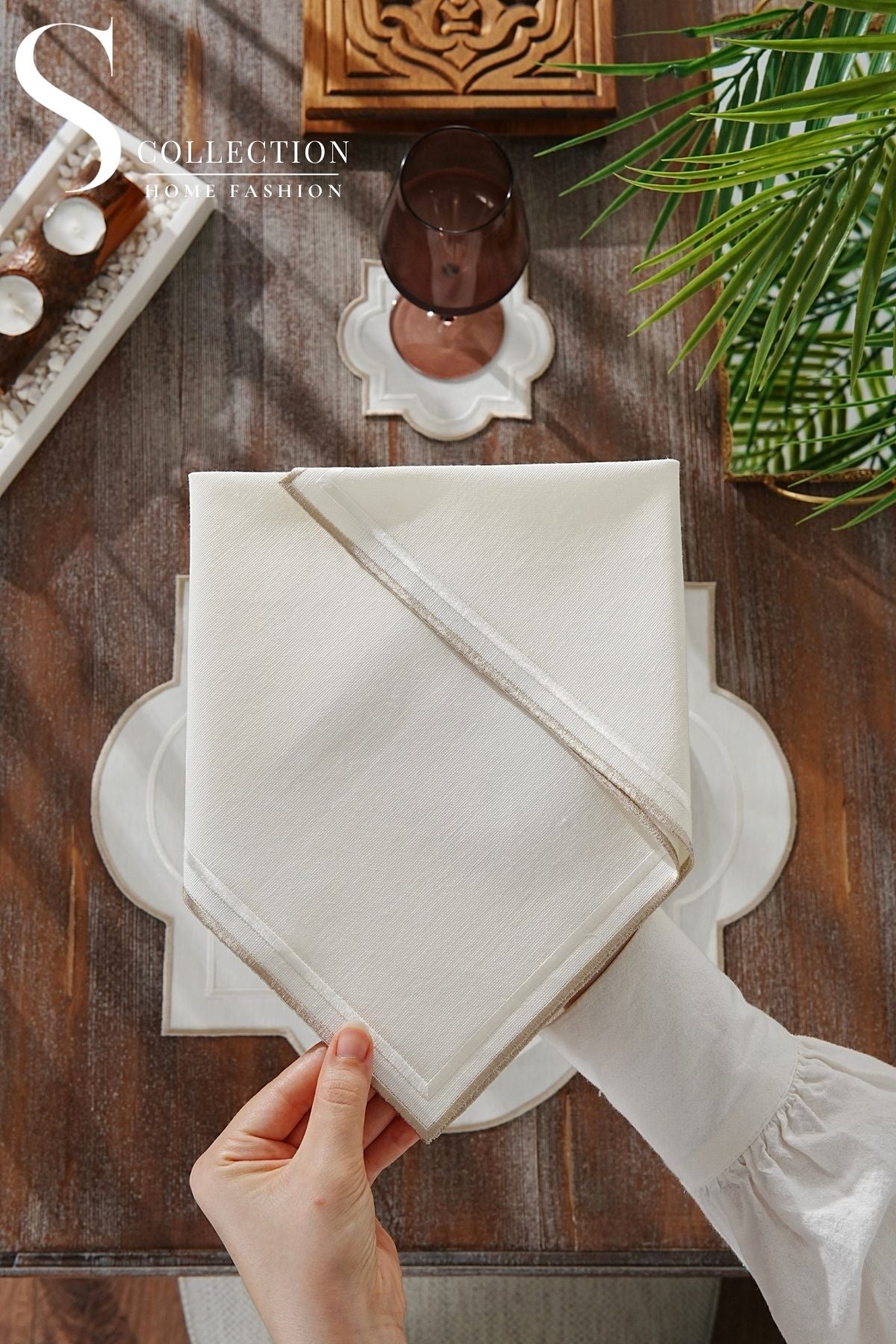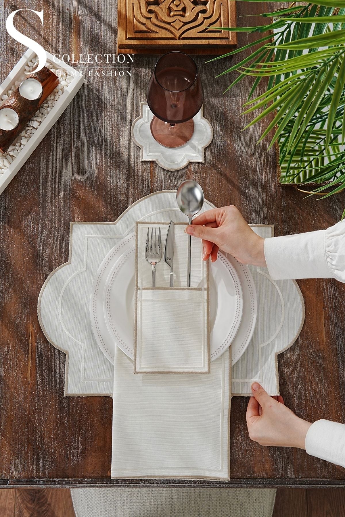 طقم مفارش سفرة - تصميم ميلان - تطريز اوف وايت وبنى فاتح (كابنشينو) - قماش مقاوم للماء - ٦ اشخاص - ٢٤ قطعة - طقم كامل