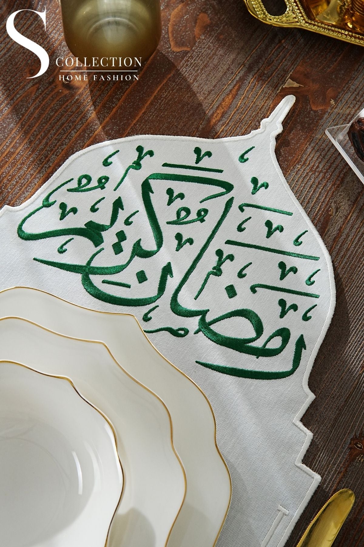 طقم مفارش سفرة - تصميم قبة "رمضان كريم" - تطريز اخضر واوف وايت - قماش مقاوم للماء - ١٢ شخص - ١٢ قطعة
