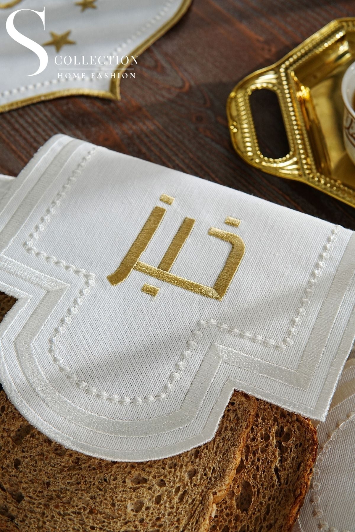 منديل سلة خبز مطرز - تصميم جراسفول - قماش مقاوم للماء - تطريز ذهبى واوف وايت