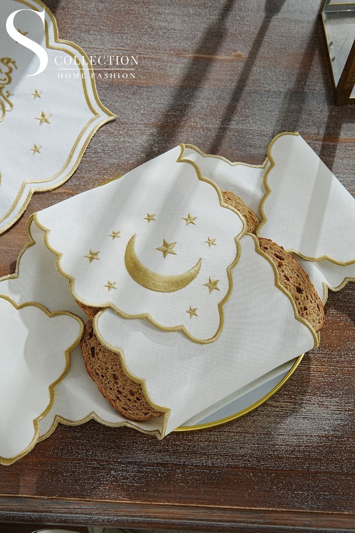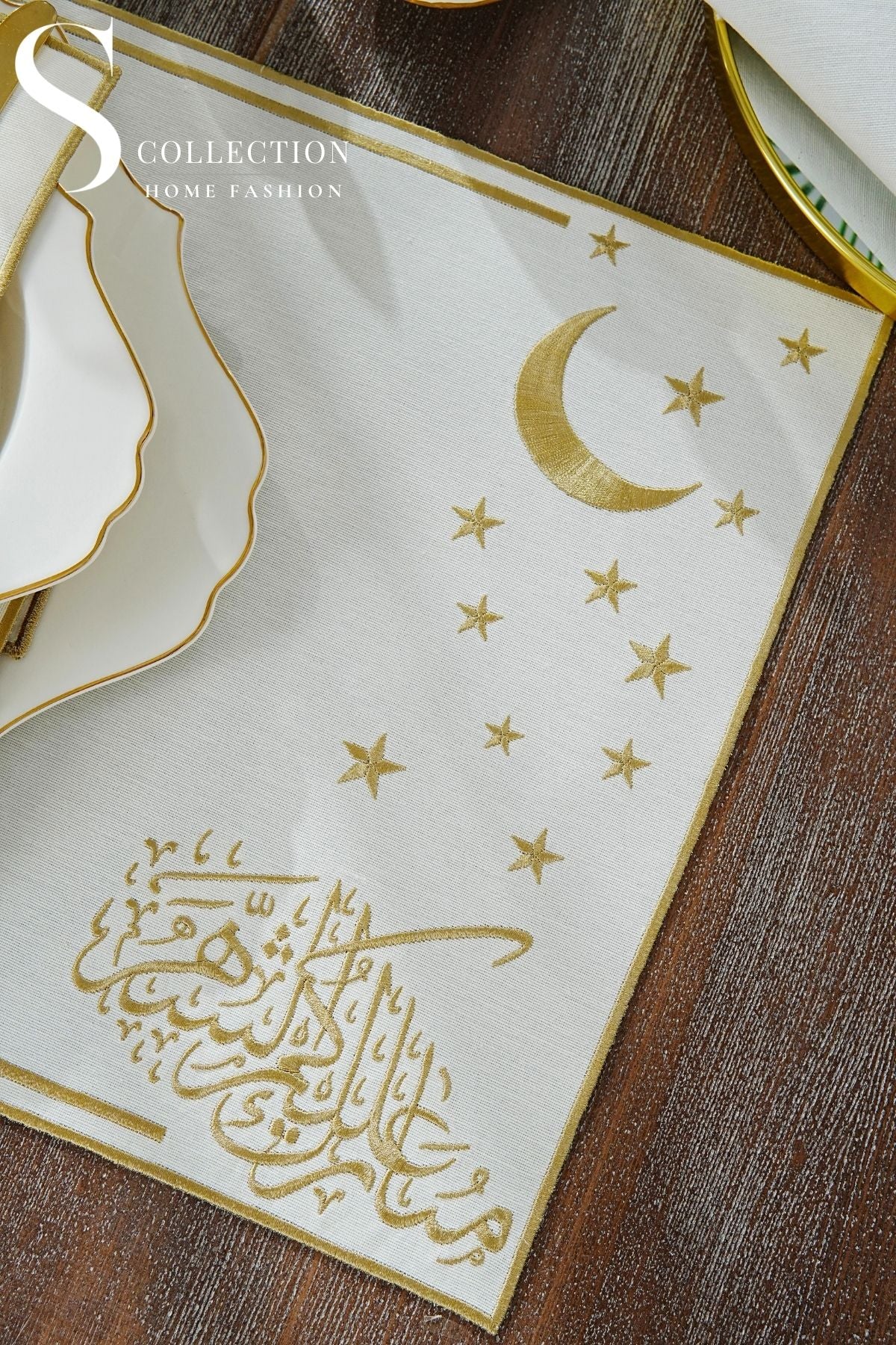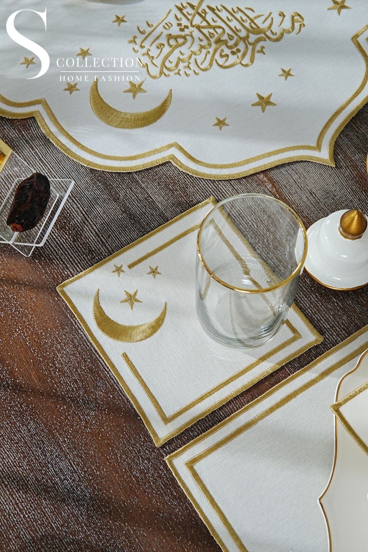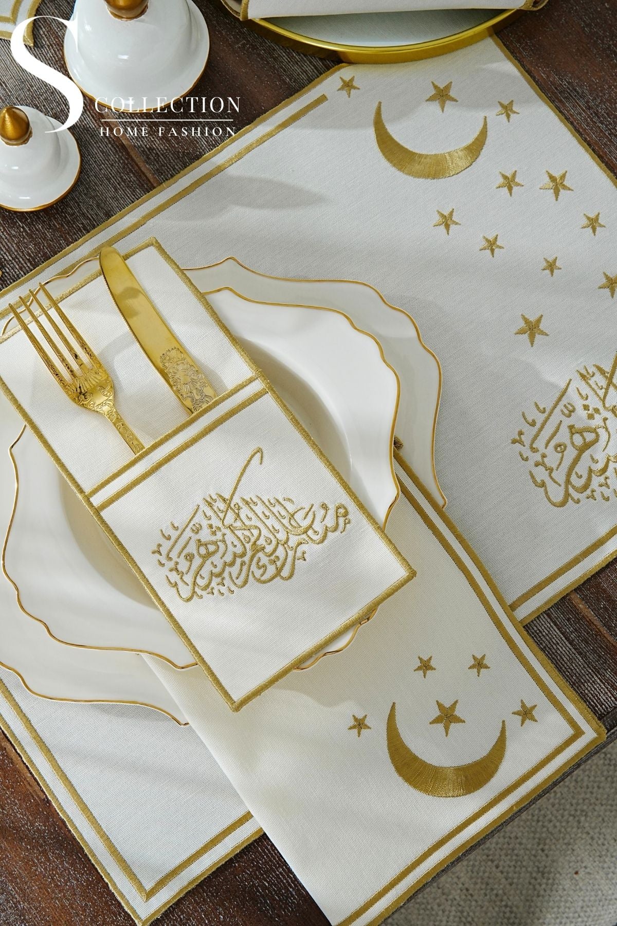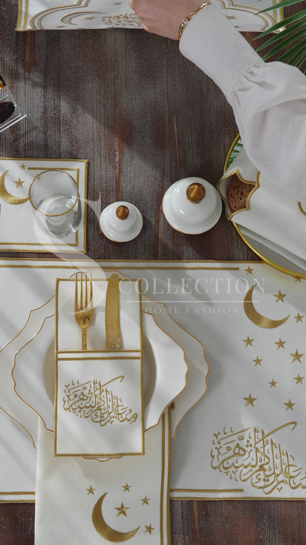 طقم مفارش سفرة كامل - تصميم ستيلار سيرينيتي رمضان - مع منديل سلة الخبز ورانر - تطريز ذهبى - ٦ أشخاص - ٢٦ قطعة