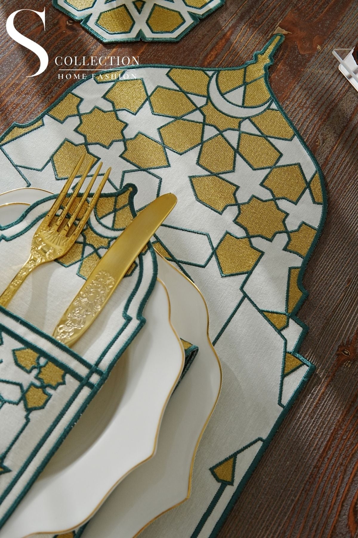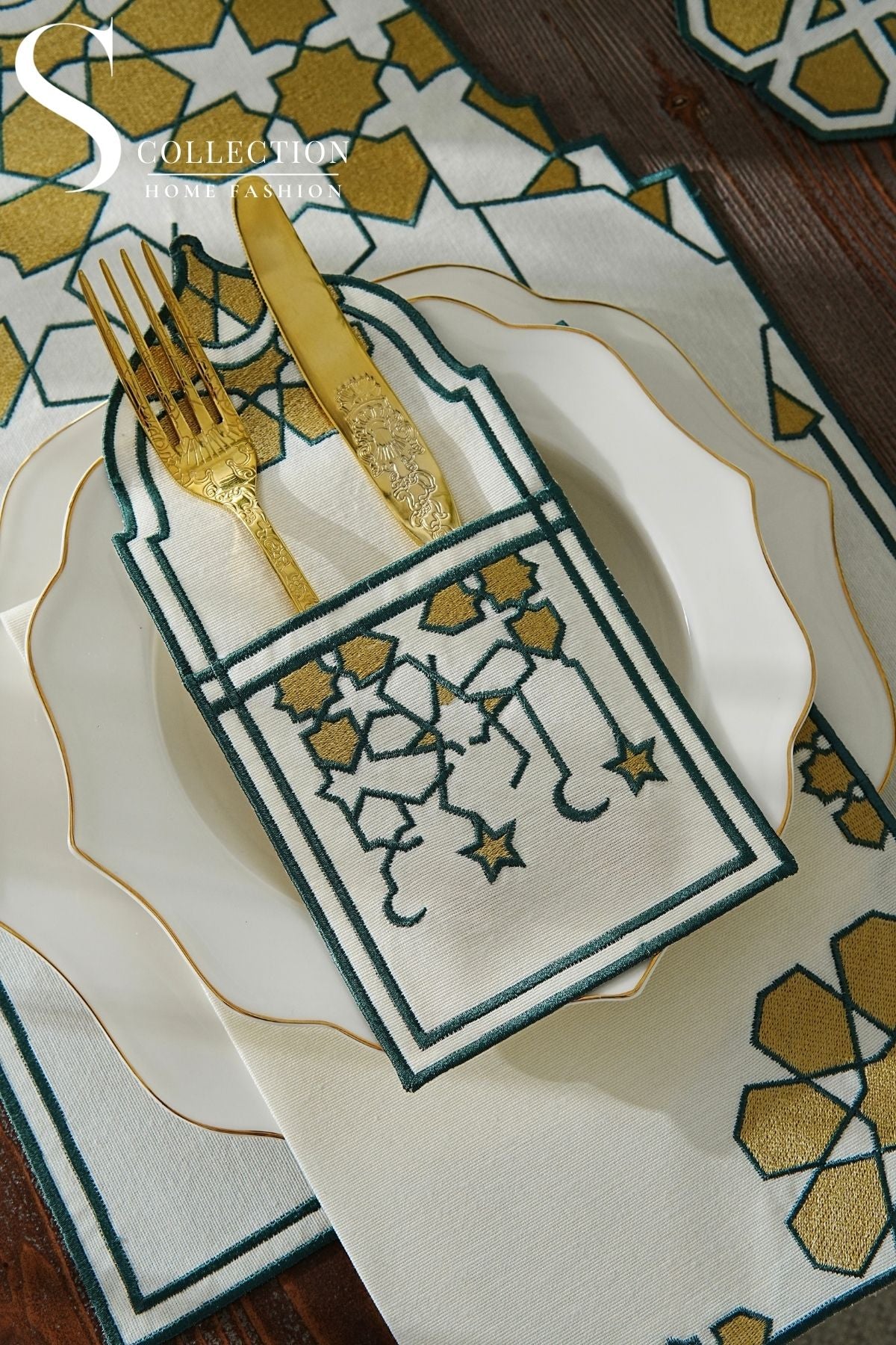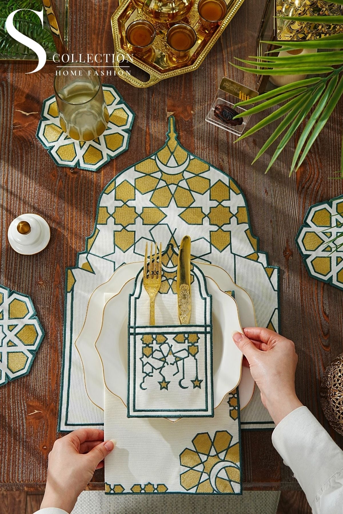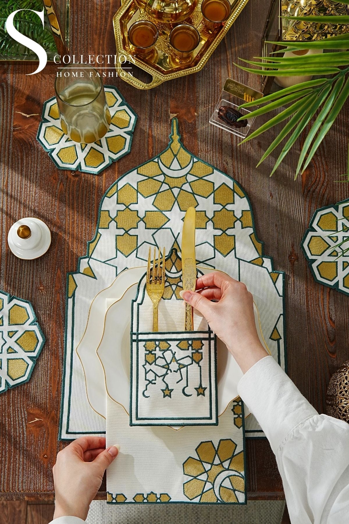 طقم مفارش سفرة - تصميم قبة رمضان - تطريز أخضر و ذهبى - قماش مقاوم للماء - ٦ أشخاص - ٢٤ قطعة - طقم كامل