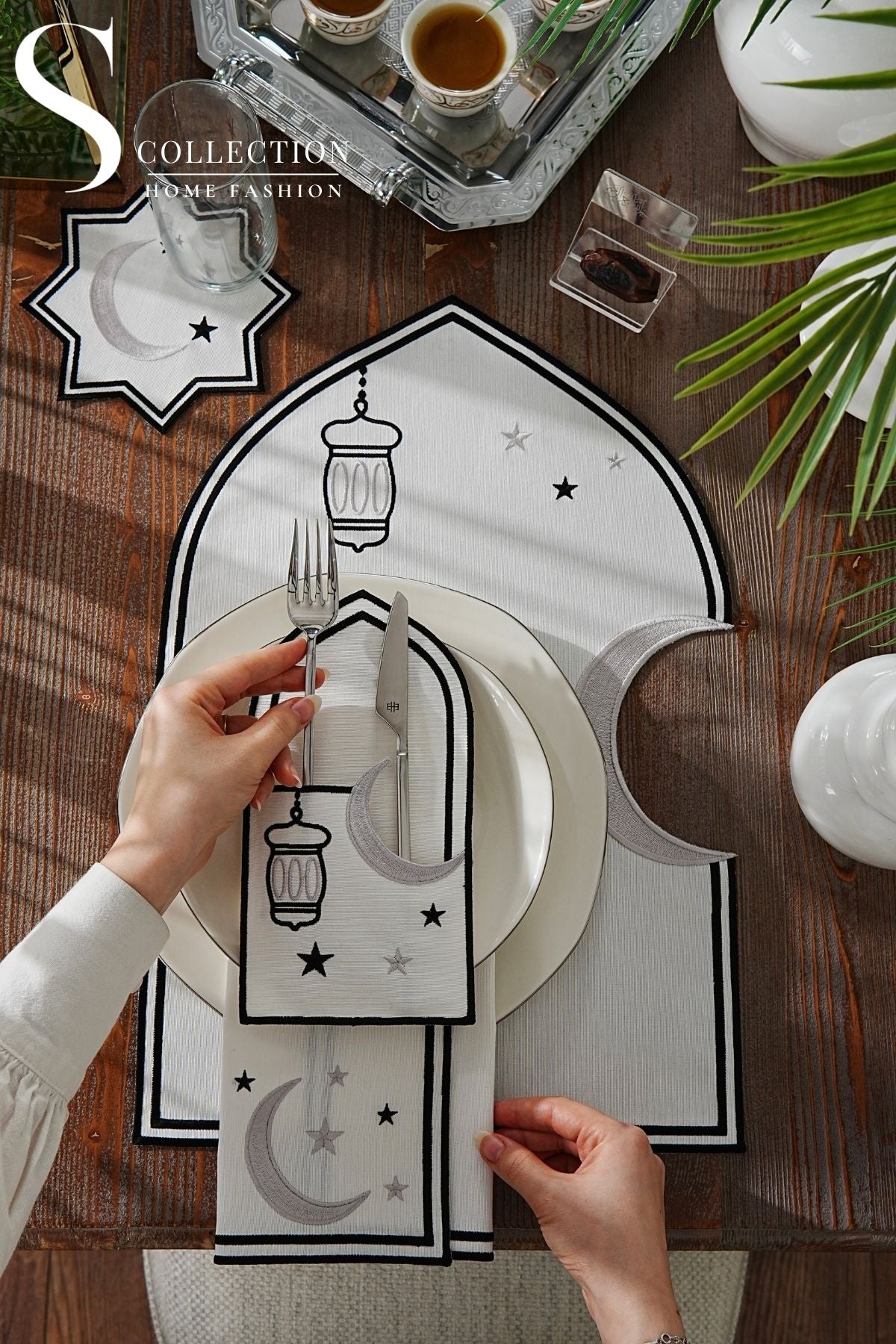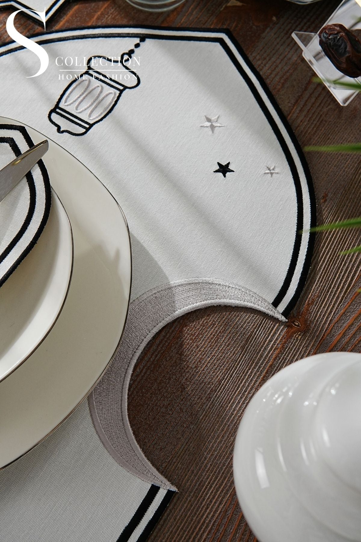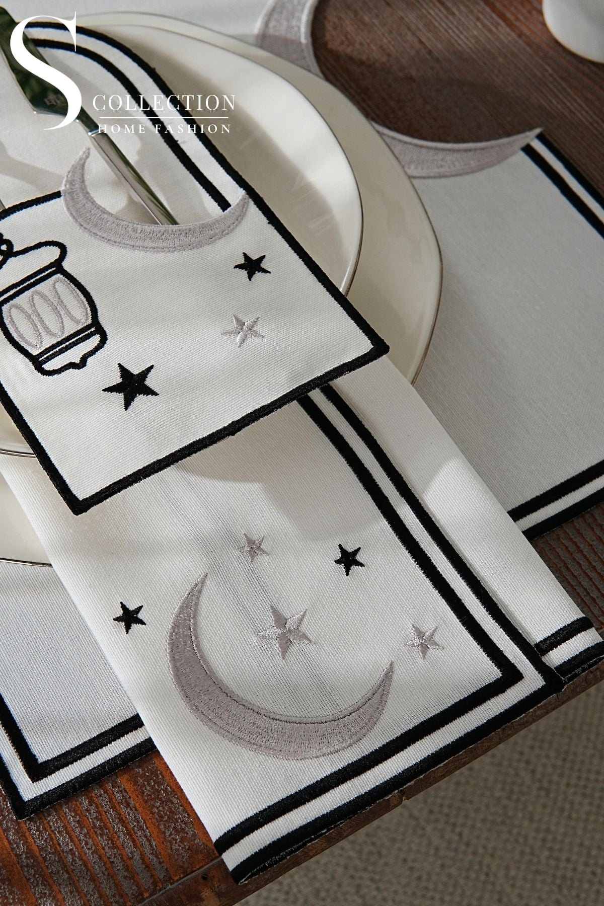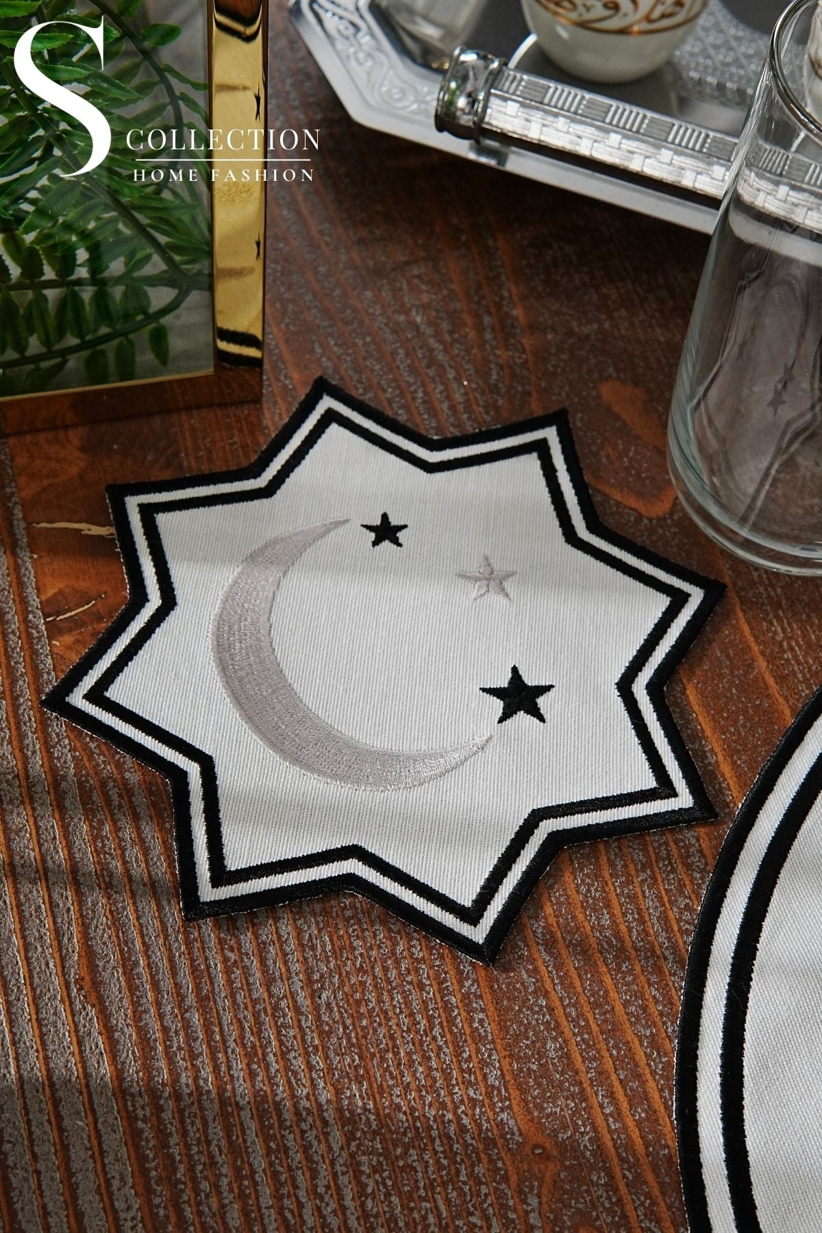 Ramadan Qamar Design Black and Silver Placemat Set - Waterproof Fabric - 6 Persons - 24 Pcs. Full Set
