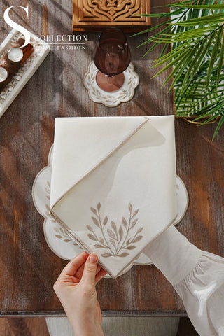 Leafy Allure Cornered Off White Design Placemat Set - Waterproof Fabric - 6 Persons - 24 Pcs. Full Set