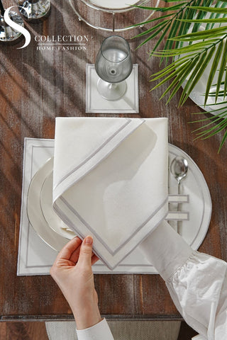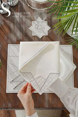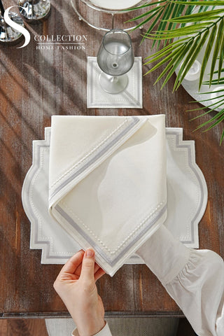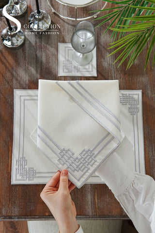 Camila Silver and Off White Design Placemat Set - Waterproof Fabric - 6 Persons - 24 Pcs. Full Set