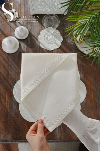 Leafy Allure Cornered Off White Design Placemat Set - Waterproof Fabric - 6 Persons - 24 Pcs. Full Set