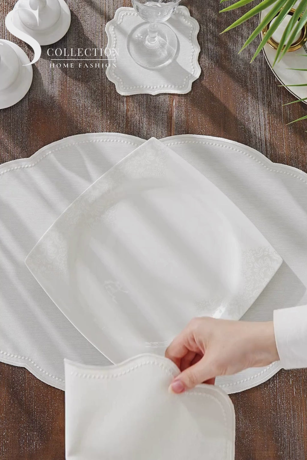 Alice Off White Design Placemat Set - Waterproof Fabric - 6 Persons - 24 Pcs. Full Set