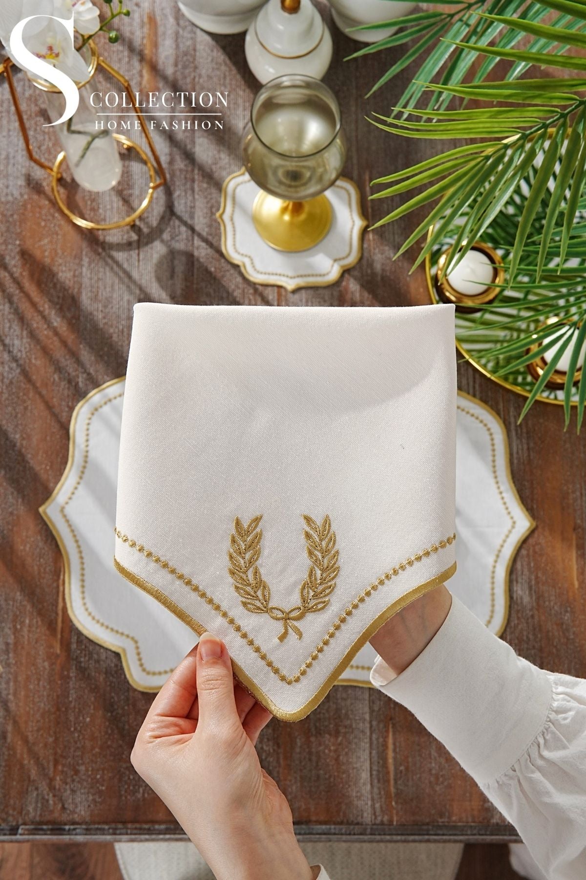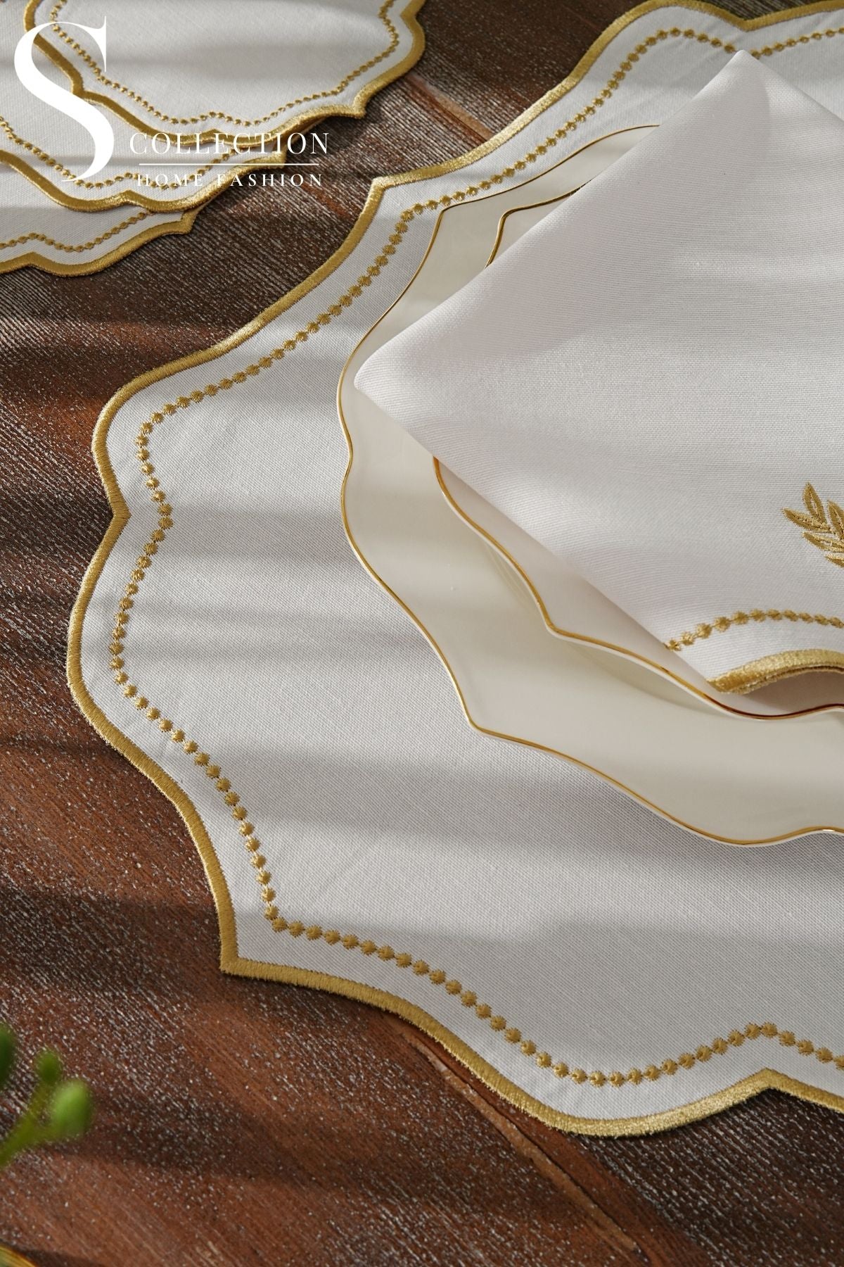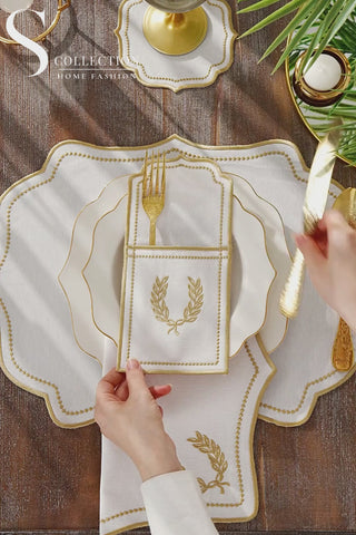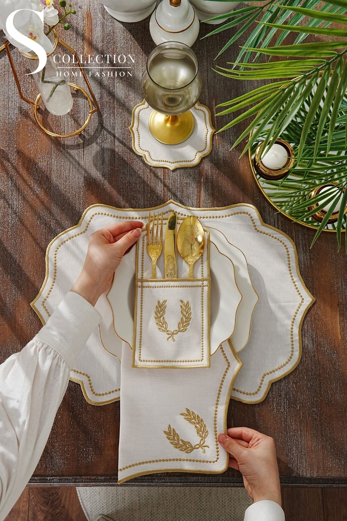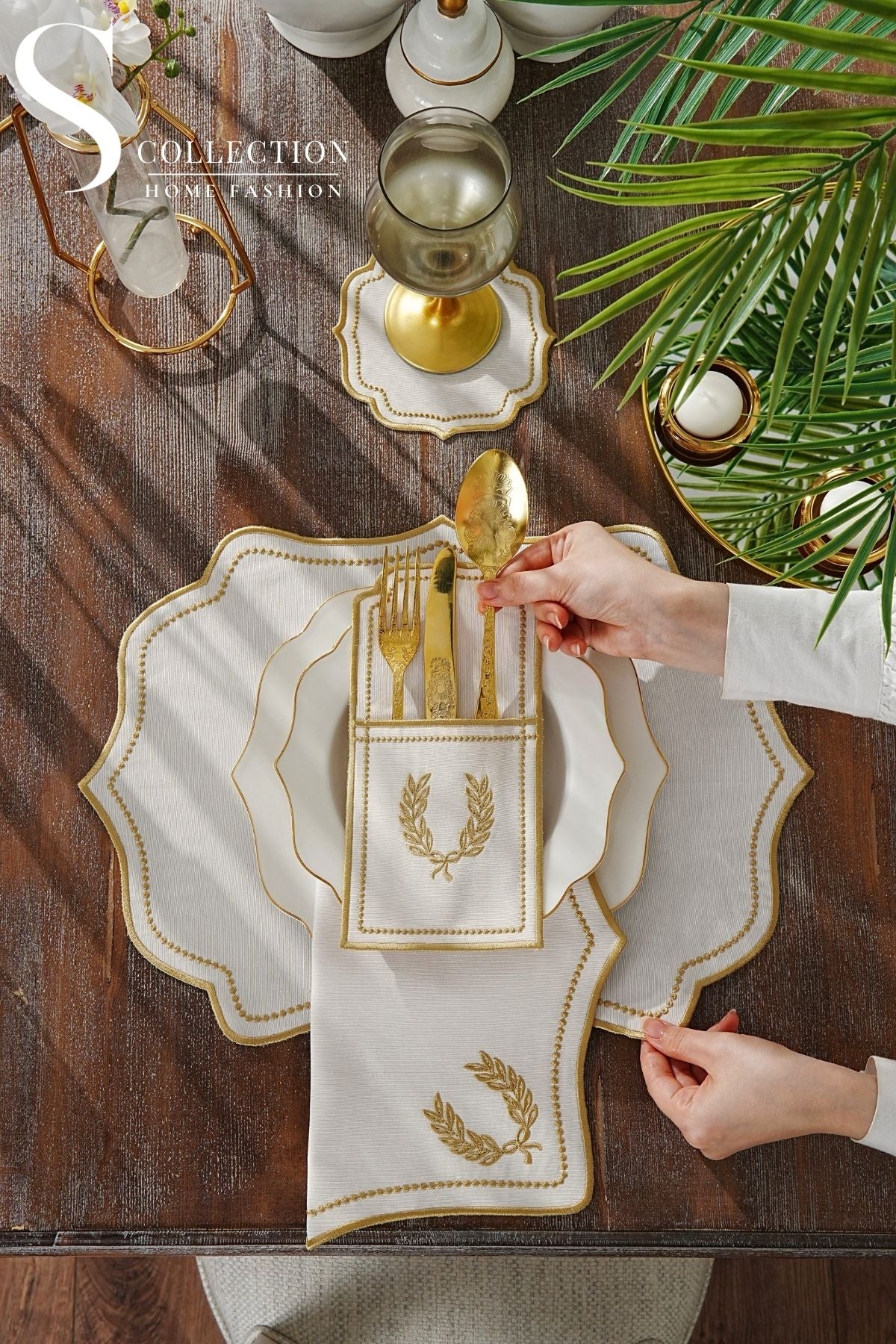 Laurel Wreath Gold Design Placemat Set - Waterproof Fabric - 6 Persons - 24 Pcs. Full Set