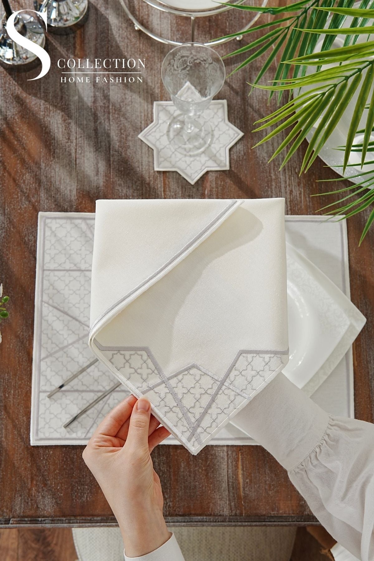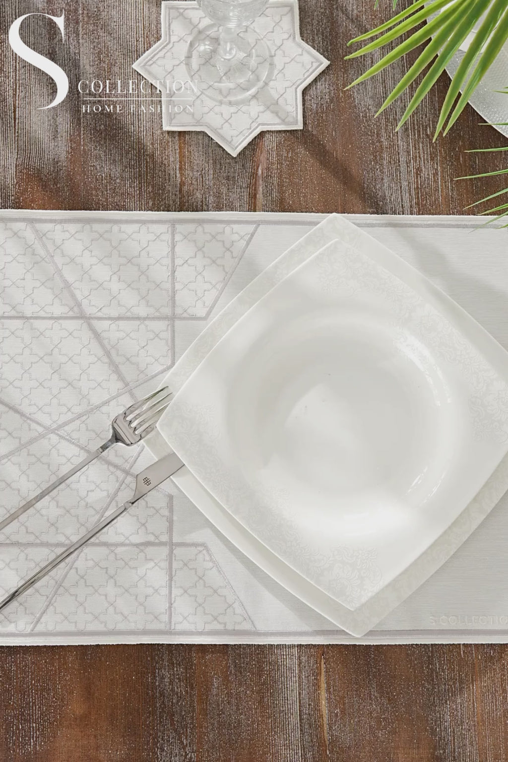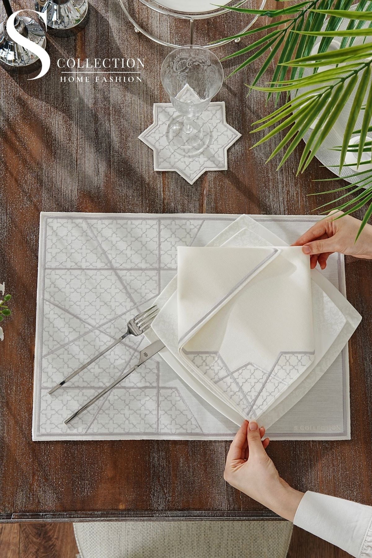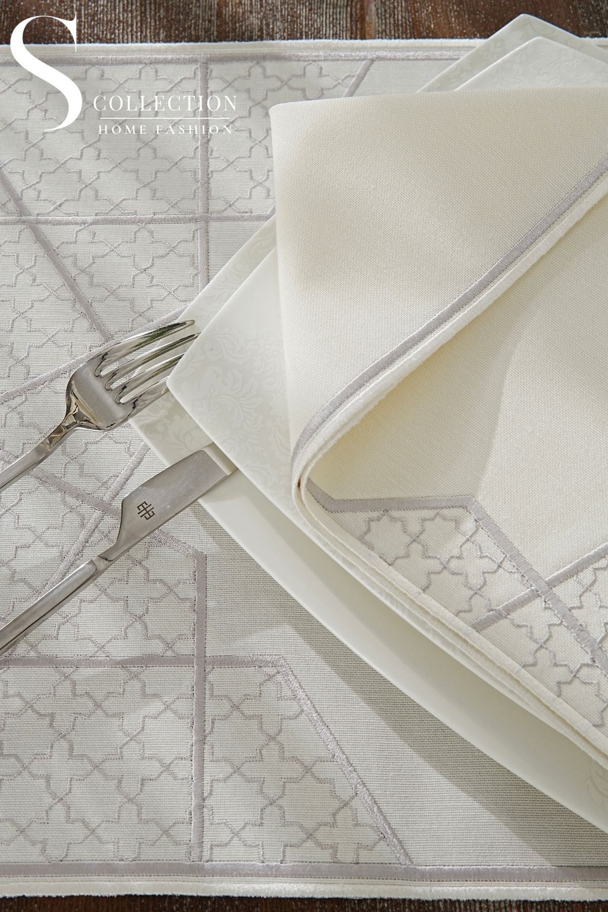 Rimal Silver Design Placemat Set - Waterproof Fabric - 6 Persons - 18 Pcs. Full Set