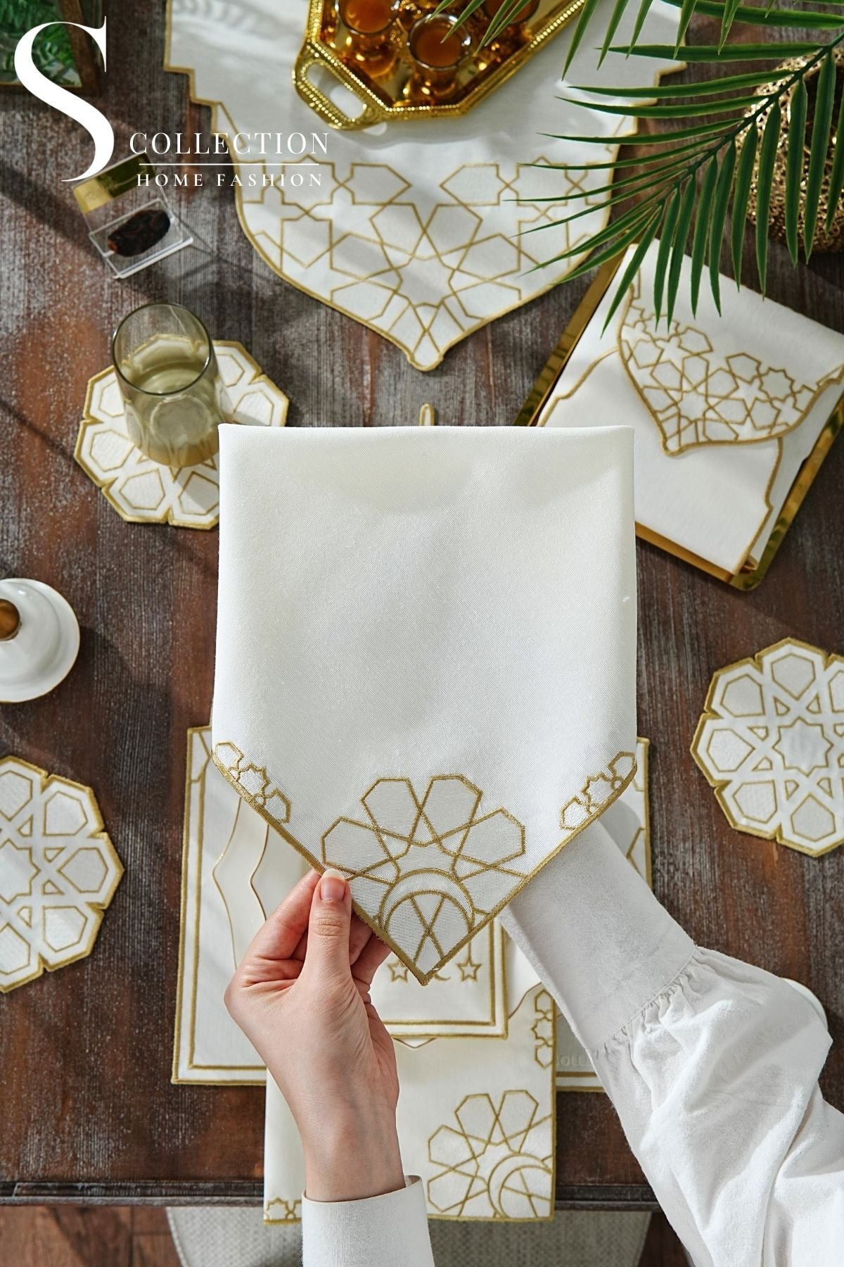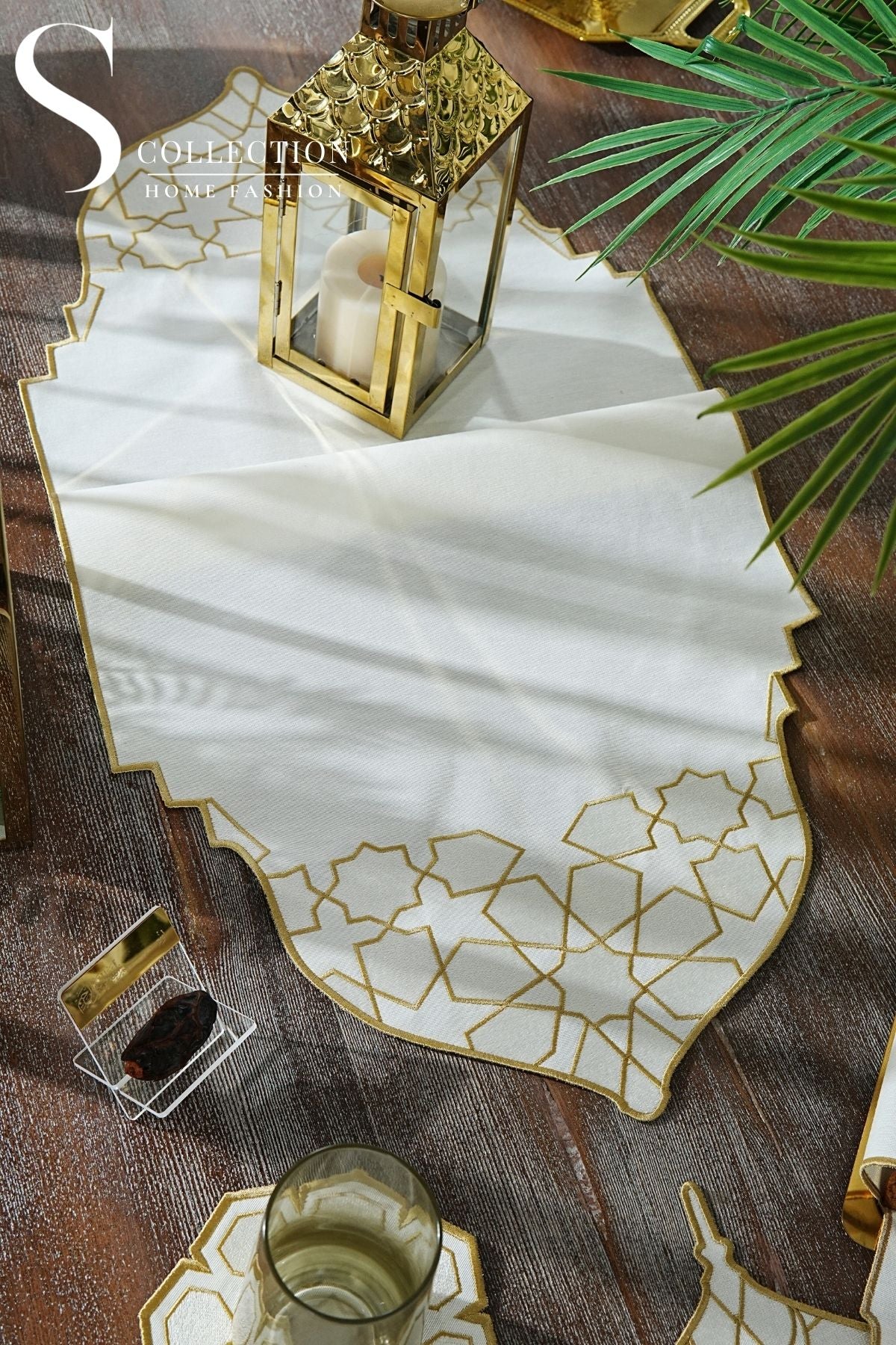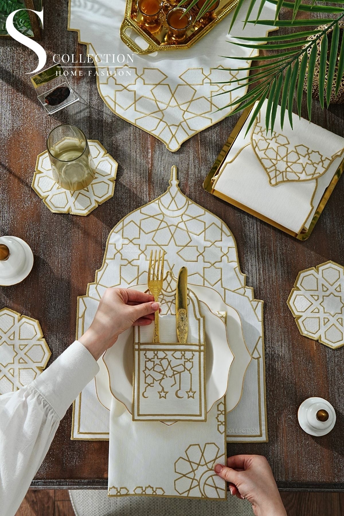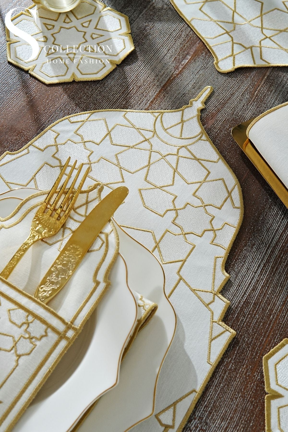 Ramadan Dome Design Gold and Off White Full Placemat Set - With Bread Basket Napkin and Runner - 6 Persons - 26 Pcs.