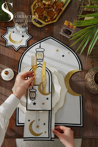 Ramadan Qamar Design Black and Gold Placemat Set - Waterproof Fabric - 6 Persons - 24 Pcs. Full Set