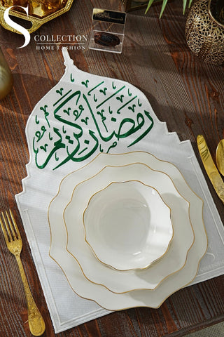 Ramadan Qubba Design Green and Off White Placemat - Waterproof Fabric - 12 Persons - 12 Pcs.